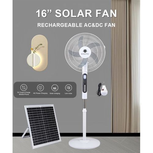 The 16 Inches AC/DC Solar Rechargeable Fan + 25W Panel & Bulb is the ultimate eco-friendly solution for cooling and lighting. Designed for both indoor and outdoor use, this innovative fan harnesses solar energy to provide powerful airflow and bright lighting. Whether you’re at home, camping, or in an area with limited electricity, this solar-powered fan and bulb combo ensures you stay cool and illuminated while reducing your carbon footprint.